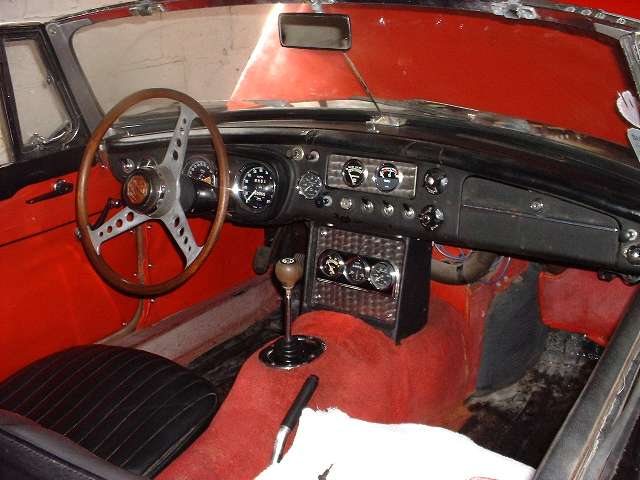 Back to the patient of the day. Bob Brownlow claims the price was right, and not too much was required to fix it up. Rusty body sills were cut out and new panels welded in. A lot of brake work was done, both hydraulic and mechanical. It was sporting new front fenders and an MGC bonnet (say what?). The original interior had cleaned up well too. |