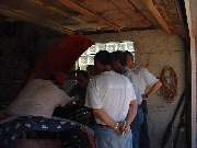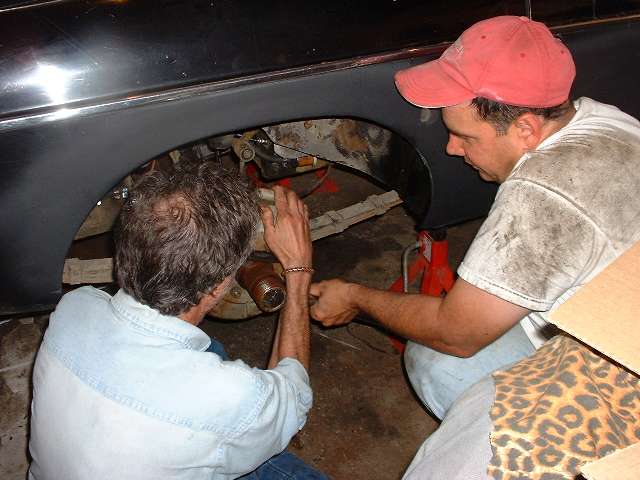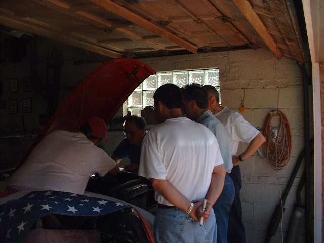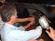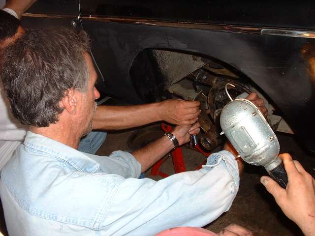 Next move was to get in and run it through the gears while running to be sure the transmission was in in good working order, and it was, including the overdrive!!! This was getting to look like a better deal all the time. So get on with the brake work, not much left there, just install the rear shoes and drums. And we had to bleed the brake lines. But Barney Gaylord had brought along the Gunson Eezibleed, so that went really well -- almost. |