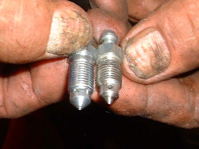 Bob had bought a set of special bleed nipples containing check valves, which were intended to make brake bleeding a one man job. The idea was to open one bleed nipple, and then just pump the brake pedal to flush the lines while the check valve would keep air from sneaking in the back door. Well that wasn't actually necessary as we were using the Eezibleed with pressure on the master cylinder reservoir, so just open a bleed nipple and watch the fluid shoot out until it came clean with no bubbles. Unfortunately, one of the new bleed nipples had a faulty check valve that refused to open. This delayed things just a few minutes for diagnosis and replacement with a standard free flow bleed nipple. Then it was time for the wheels, and kick out the jack stands, and time for a test drive and a victory picture. |