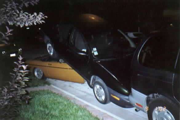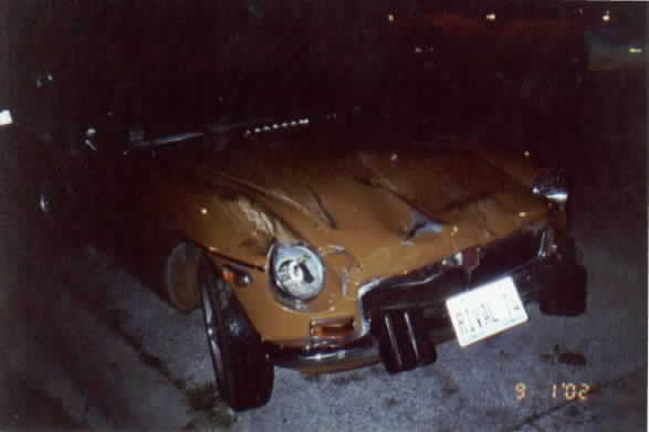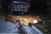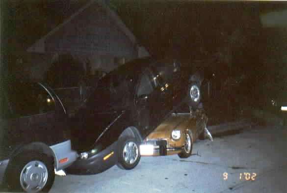 Wanted to show you the pics. On the 1st at 1am a drunk came around the curve too fast, plowed into our yellow Midget, hit the rear of our MGB, pushed it into a Saturn. The MGB went under the Saturn, and both went into a Merc. Villager Van. Sue heard the crash, called me to come outside ( I was in the basement). I went running out in my "shorts, t/thirt, no socks", was ugly. Looked down the street & saw a person getting out of his car. Time I got down there he was pulling out the plastic bumper out from underneath; it was acting like a skid under his tires & he couldn't steer. Thats the only reason he stopped. I told him, "You hit my cars". He tells me sorry, no hard feelings, want to be friends? Wants to shake my hands. I want to punch him in the head. I took his hand & said come down & lets look at 4 months work on the MGB & 3 months on the Midget restoring them & you took them out in a heart beat. He had no insurance-glad I have full coverage. I got to watch the cops do a drunk test (he could hardly walk) & saw him handcuffed & taken away.