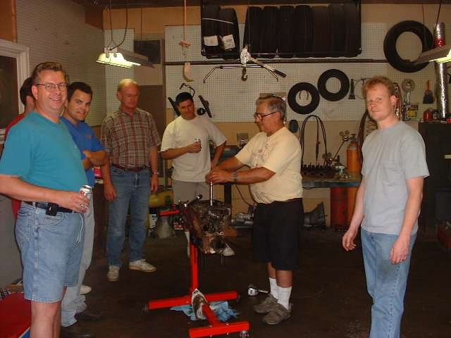 Half way through the first morning, with one engine mostly disassembled, there was a short pause for a demonstration of the "calibrated arm". Main bearing caps call for 70 lb-ft torque. Barney Gaylord gave the nuts each in turn a good twist with a 1/2 inch drive ratchet handle. This was followed by a torque check with an actual torque wrench. Each nut measured between 74 an 78 lb-ft of torque required to make it turn just a bit more. How does he do it? Lots of practice.