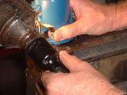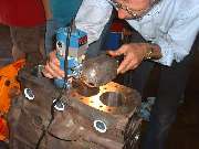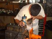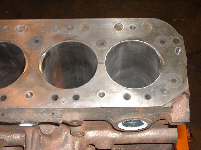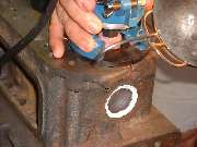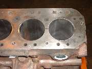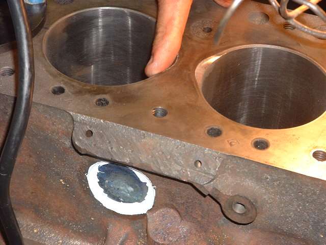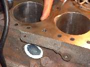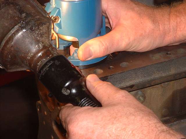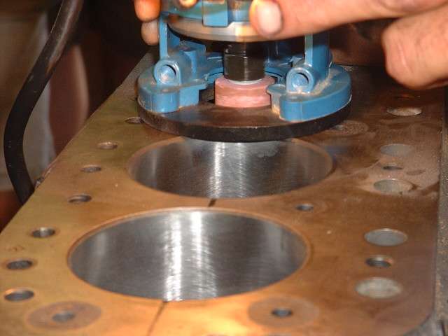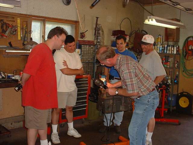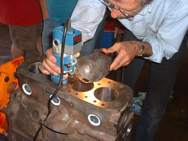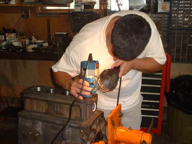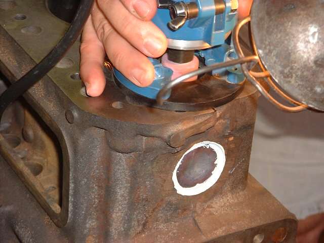 Later in the day, when it was decided to install a high lift cam and a shaved head on the new engine, it was necessary to cut "eyebrows" in the top of the engine block for clearance for the valves at full lift. After a bit of careful layout work with a scratch awl, several members took turns with the router and one inch grinding wheel cutting the small reliefs in the iron block. Given the right tool this is an amazingly simple process taking less than 5 minutes per cut.