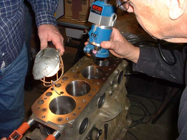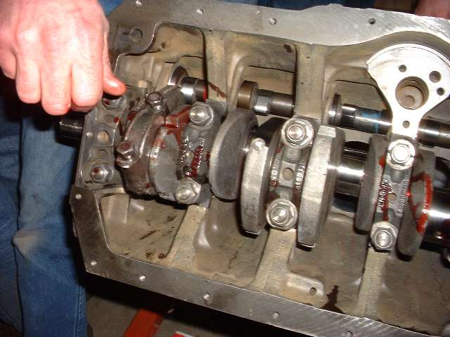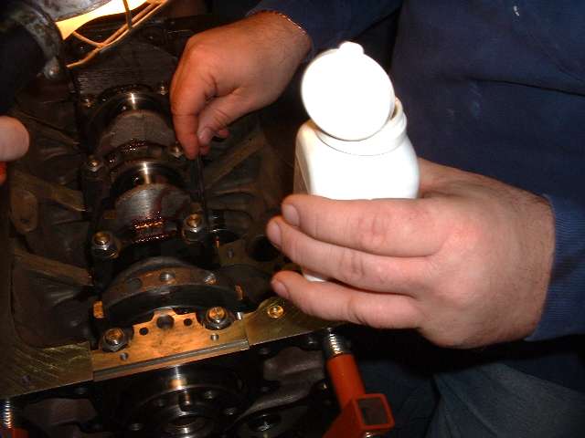Grinding eyebrows in the block for valve head clearance to accomotate the high lift camshaft. Plenty of assembly lube used for crankshaft bearings and camshaft lobes.