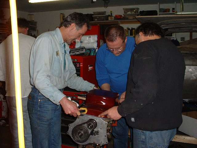 Measurements with a dial indicator and a degree wheel on the crankshaft to check the valve timing. Notice the very thin temporary valve springs used during setup and measurement. This allows one to depress the valve with one finger to check overtravel clearance for the valve head at full lift. Camshaft timing adjustments can be made by skipping the timing chain over a tooth on the sprocket (9 degree increments) and with offset keys for the cam sprocket (+/-4 degrees in 1 degree increments). Nearing end of day, buttoning up the short block assembly and installing the cylinder head. Engine painting and installation of accessory parts will be finished before installing engine in the car at the next tech session..