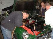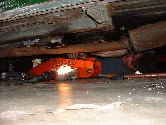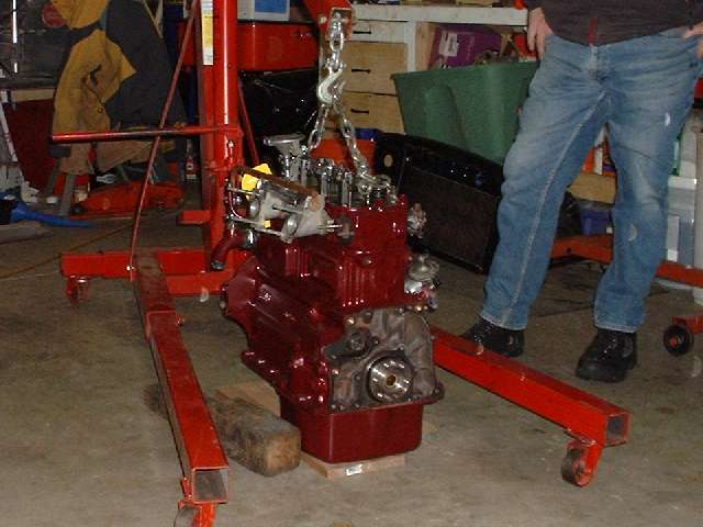 There was another shot delay when John Schroeder took a quick trip out to pick up some new bolts for the engine mounts. Seems like his plastic bag system of storing small parts for two months wasn't always working. But it did finally come together as the gang was stuffing the engine under the bonnet by early afternoon. Wade Keene got the honor of groveling around on the floor for half an hour (or more) lacing up the gearbox rear mount and crossmember, the propshaft, speedo cable, and wiring for the reverse light switch. We did save some pizza for him. Someone needs to remind John that he still needs to get a new exhaust pipe center hanger installed.