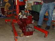 Session 3 of 3, engine installation day. There it was at 9:00 am in all its glory, still on the engine stand, nicely painted and detailed, just waiting to be nestled into the car to begin putting power to the road. First business is to pick it off the stand and install the rear plate, rear seal, seal retainer plate, and those curious locktabs on the rear plate bolts. I hope someone remembered to bend up the tabs?