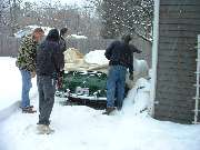 Time to bring the car in and warm it up a bit, after we get a few inches of snow off of the car cover. Half a dozen people make short work of pushing the car into the garage, and we all get to warm up again. Installing the clutch pressure plate caused a bit of a delay. It seems the machine shop had removed the three alignment pins when resurfacing the flywheel, and the pins were still missing. Bill Hedrick took a quick trip home to retrieve a Midget flywheel, but no one could get the pins out of that one. After a quick phone call, Kim Tonry was called upon to pull a couple of pins out of one of his MGA flywheels, while Barney Gaylord took a trip home to bring back two new pins and two more used ones pulled out of another MGA flywheel. That was enough with a few pieces to spare.