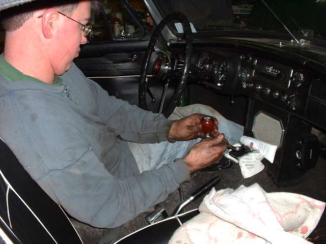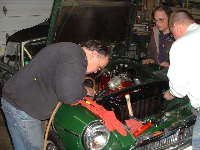 One more momentary delay to clean some rust out of threads on the cylinder head so the flare nut would tighten down on the temperature sensor. Things went better after the engine mounts were bolted down. Just a little fiddling with the throttle linkages on the HS4 carbs, easy installation of the radiator, oil cooler, generator and oil filter. Meanwhile Wade takes a well earned rest in the driver's seat while he installs the shift lever and boot and knob. Add fluids, check ignition timing one last time, open the garage door a little for ventilation, and fire this puppy up. Notice the grins all around during the 20 minute 2000-2500 rpm cam run in and engine warm up period. Then retorque the cylinder head, readjust the valve lash, fine tune the carbs, and it's time for the test run. Nice that the snow let up some, and yes, the grins were still there after the test drive(s). All is well with five weeks to spare for test and tune before the Missouri Undurance Rally. Yee-haa!.