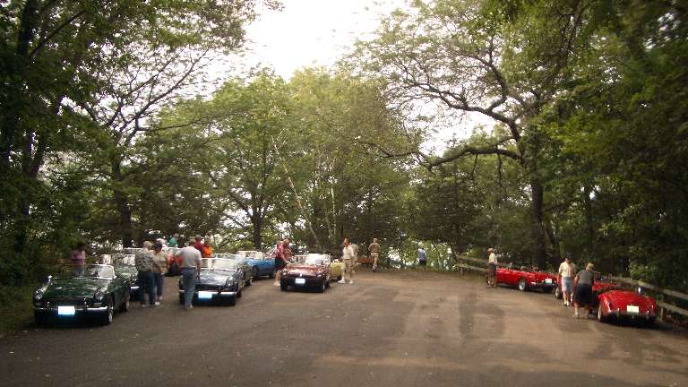 Thirteen MGs on tour stop at Lookout Point in Mississippi Palisades State Park