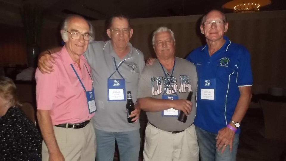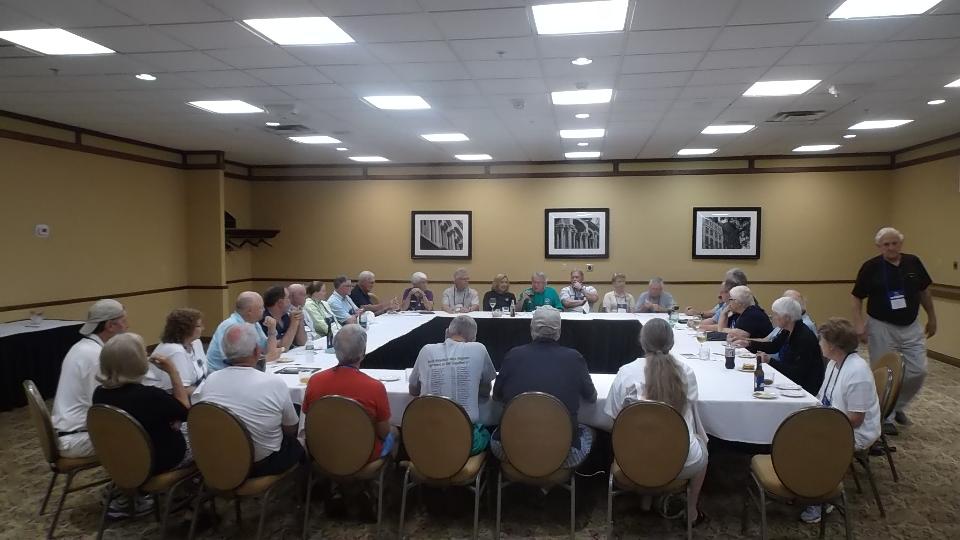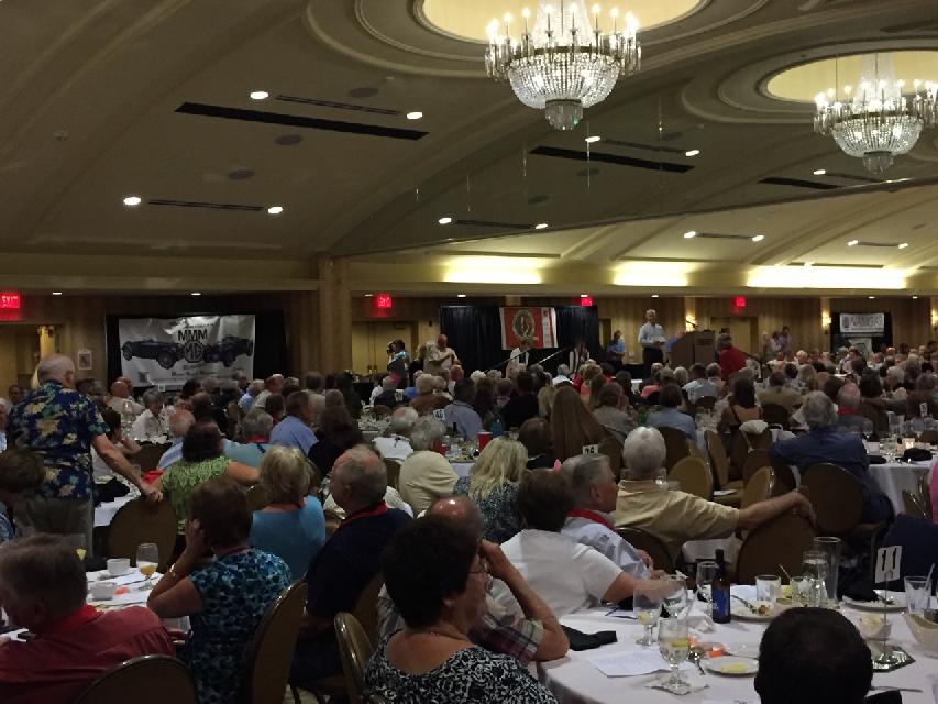 In the early evening there was a First Timers Reception (1 hour) which I was requested to attend (perhaps technical reference for the new folks). This was followed by four consecutive Register Night banquets in adjacent rooms (2 hours). Sorry if you belong to more than one of the national MG registers, can't be in two places at once. Then the partitions between banquet rooms were opened to combine all into a single gigantic room looking like an airplane hanger. For the next two hours we had live entertainment by Captain Rat and the Blind Rivets Band. Wow! Five hours in the banquet rooms without stepping out. And after 10-pm lots of folks headed for the Lounge to chat. That bunch in the photo below center is myself with some of the Australian world travelers.