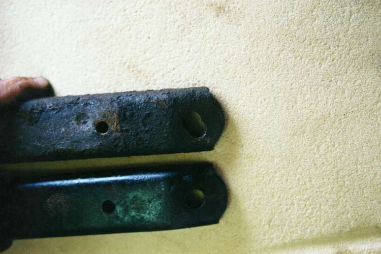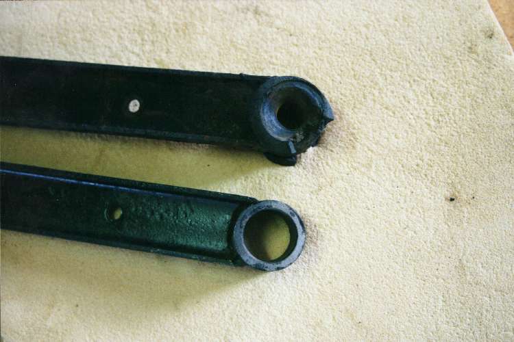 Good and bad a-arm outer ends. Notice the badly worn bolt hole.