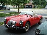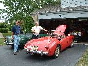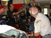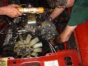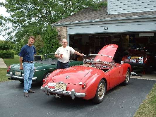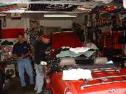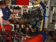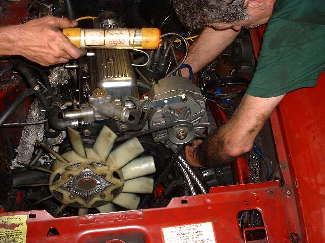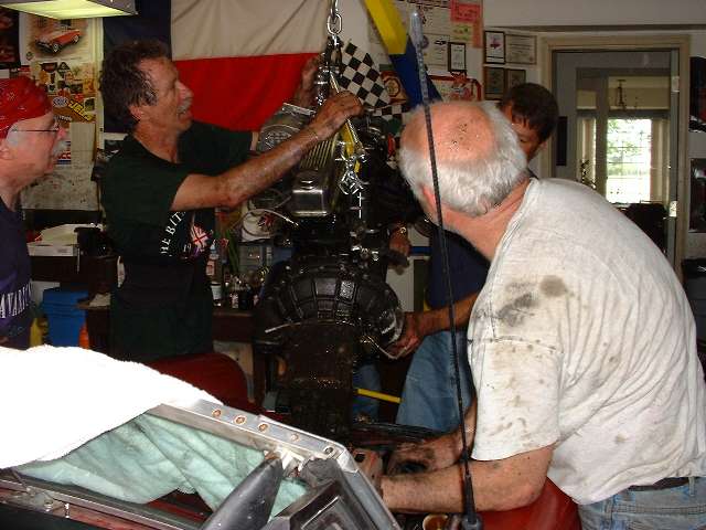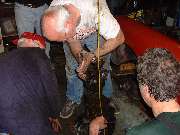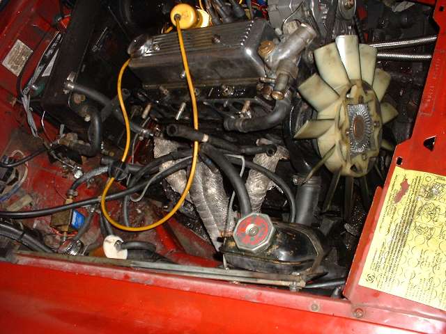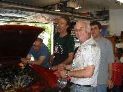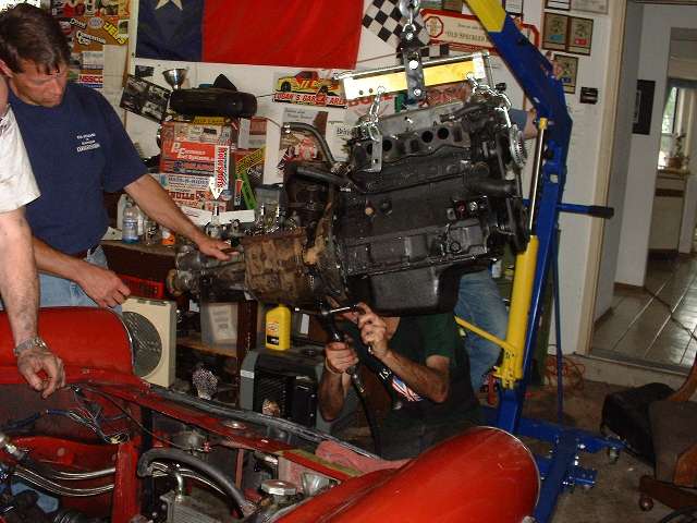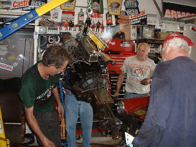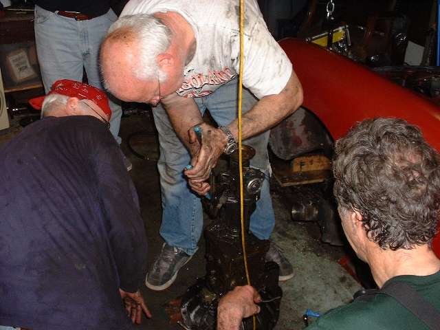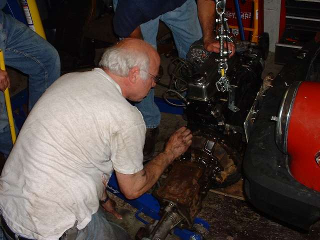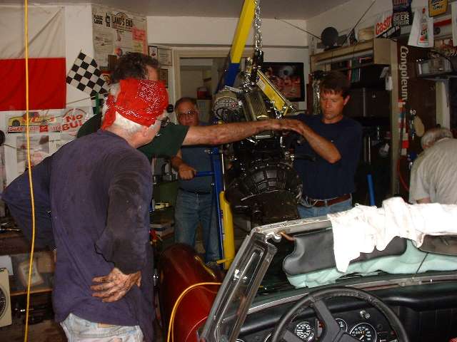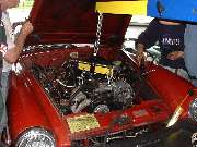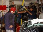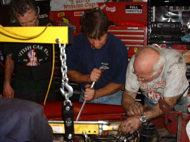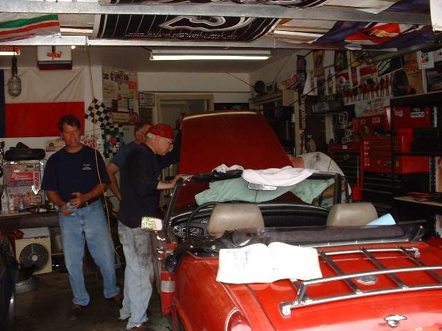 Ourdoors we were just enjoying some sun while waiting for everyone to show up. The patient inside is a late model rubber bumper MG Midget with the Triumph Spitfire 1500 engine. Once we had a quarum it didn't take long to get down and dirty.