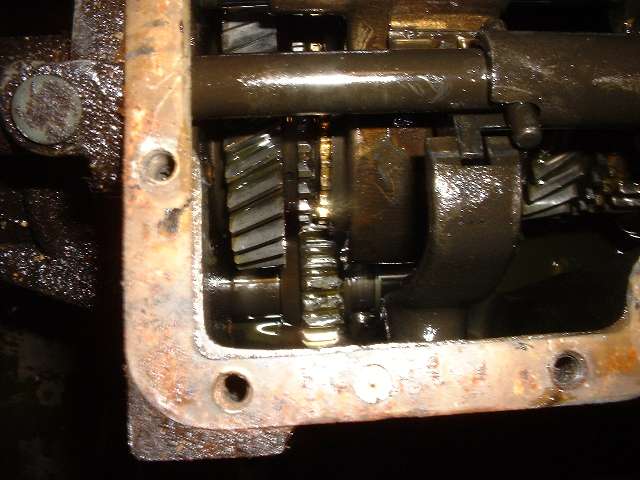Then there was more prying and pushing to get the engine back in the car. Disconning all the exhaust system hangers helped a lot, and didn't take much work to reinstall. By mid afternoon it was all reassembled and back on the road. The test drive left some questions about function of the syncronizers, possibly a lubrication problem after the gearbox has sat in long term storage, but that would be worked out later. Final picture shows the reason for needing the work, broken teeth on the reverse idler gear. With a few parts this looks like a good candidate for overhaul at a future tech session.
