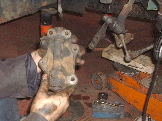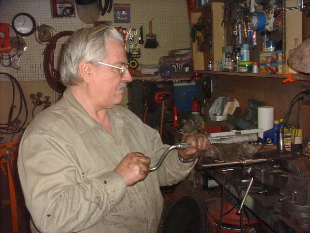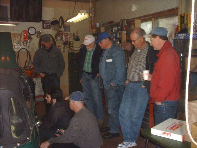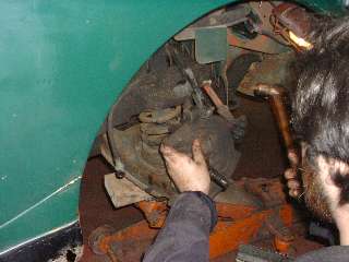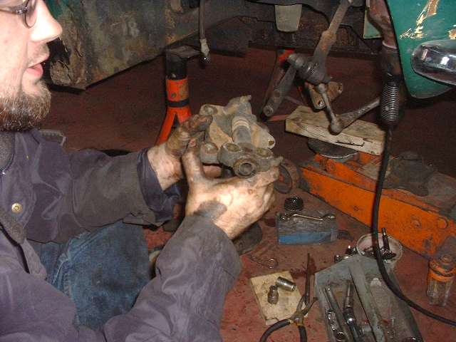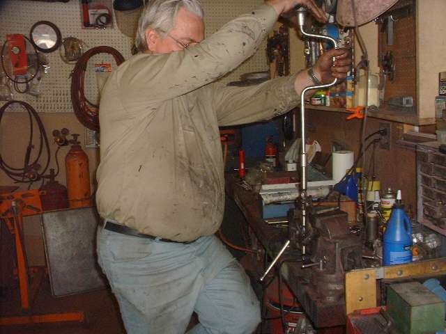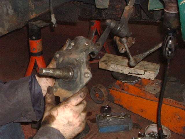 Seth was doing well at this point, pulling off parts right and left while the onlookers were dually impressed. When the first steering knuckle and kingpin assembly was off Barney went to work with hammer and punches to replace the kingpin bushings. The new Midget kingpin reamer was then unwrapped for the first time and pressed into service to ream the bushings for a perfect match to the kingpin diameters. Well there was one little hitch. The new bushings were a bit too small on the ID so the pilot diameter of the reamer wouldn't pass through. A Dremel tool with a small sanding drum was used to open the bushings a tad. Then use oil liberally and turn the reamer clockwise only to keep the cutting flutes sharp, and that little task goes off without further incident. Meanwhile Seth was reassembling the right side with all new parts, as the rebuild knuckle would be a spare in reserve.