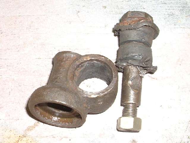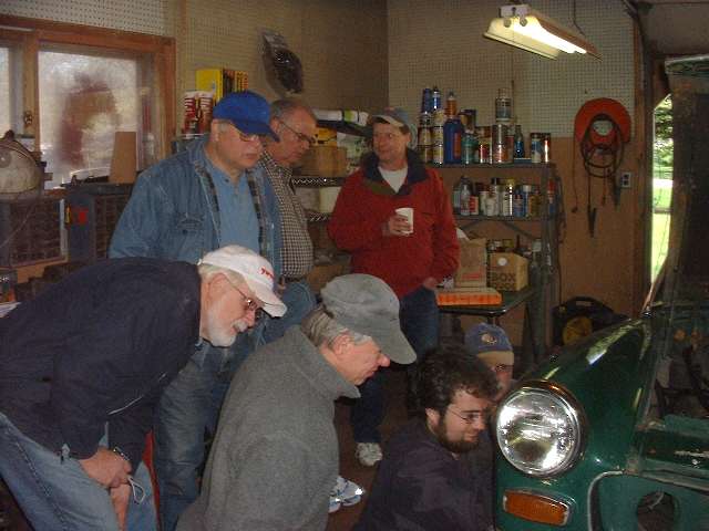 At least eight club members came with an interest in this procedure, and a few more may have come and gone during the day. Seth Jones made a prudent decision early and started on the easier side of the car where he knew it have been apart more recently. As a result the suspension came apart with only moderate encouragement from the big hammer. Set the car body on jack stands, jack up the A-arm to unload the suspension joints, and proceed to disassemble everything above the A-arm outer pivot point. When parts above are disconnected lower the jack to remove the coil spring, then disassemble the A-arm inner pivot parts. That top trunnion in the right photo was one of the least of our worries for the day, just install new rubber bushings and it will be ready to go again.