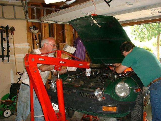 Start with the car raised on jack stands so there's space to work underneath. Remove most of the accessory parts and all of the wire connections, hoses and linkages from the engine and gearbox. Attach lifting device, unbolt propshaft, engine mounts, and rear gearbox mount, and WAIT A MINUTE! Please detach speedometer drive cable and ground strap from gearbox before lifting. This is about half of the grunt work, just getting the engine and gearbox out of the car.
