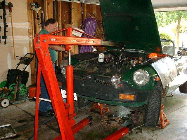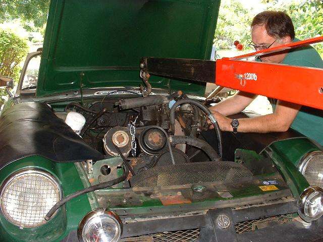 Put the B on jackstands, this time without damaging the radiator, and drained the oil and the radiator. Removed the radiator, distributor, and starter, disconnected the car linkage and fuel lines. Things were going smoothly, so I started to worry. Went to disconnect the oil cooler lines. Didn't have the right size wrench, so I took off the oil filter head, leaving the line connected to it. Still didn't have the right size wrench for the line to the block. Barney Gaylord had arrived by this time and went to the hardware store (trip #2) for the right size wrench. In the meantime, I started to disconnect the drive shaft, and then I realized that it would be easier to remove the front yoke and undo the four bolts with the gearbox out of the car. I then removed the crossmember. Barney was back by this time, and we removed the last oil cooler line. We removed the bolts for the motor mounts, and connected the hoist. The engine and gearbox started to come out. Oops, forgot the disconnect the wires to the TCSA switch and the reverse light switch. Now the engine and gear box came out.