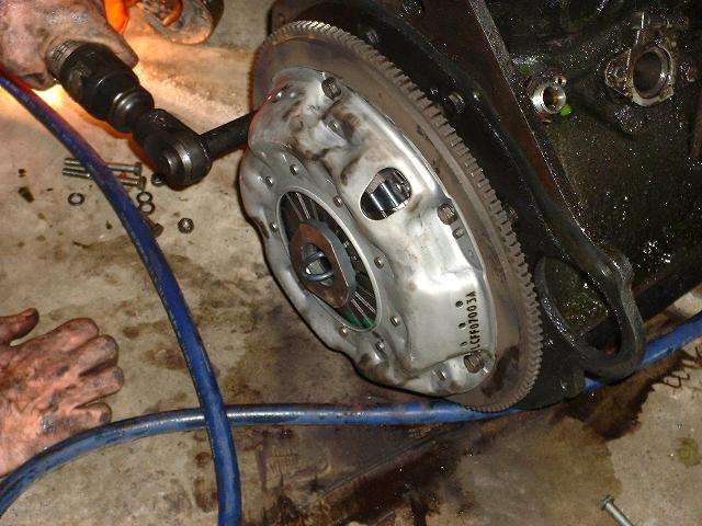 Next I removed the gearbox from the engine. The throwout bearing was well (ab)used with the carbon about gone. Not a problem, since I was going to replace the clutch anyway and had a three piece clutch kit. The flywheel was in good shape, and the driven plate about half gone. Checked the rear main seal, and since it wasn't leaking, decided if it ain't broke, don't fix it.