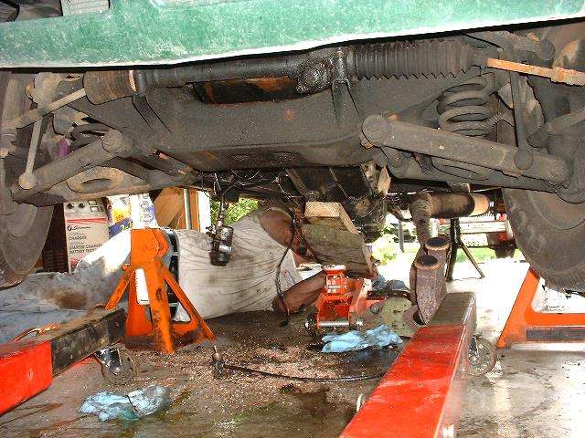 But when putting the engine in, we noticed that the front mounts while not broken, had sagged. Picked up a pair of new of new mounts (does this count as trip #5?) and went to install them. From experience, I have found that the easiest way to do the left mount is to remove the steering pinion. Pulled the pinion, and went to install the mounts. The mount on the passenger side went smoothly, and went to do the driver's side. All of a sudden I heard a crack, and the engine dropped. The front rocker arm pedestal stud had snapped, and the engine fell. If that was not bad enough, the harmonic balancer hit the crossmember and broke. Picked up from Barney a new stud, and from Tom Sotemeyer a used harmonic balancer ((trip #6 and 7?) Installed them with no problem, and was able to continue the work.