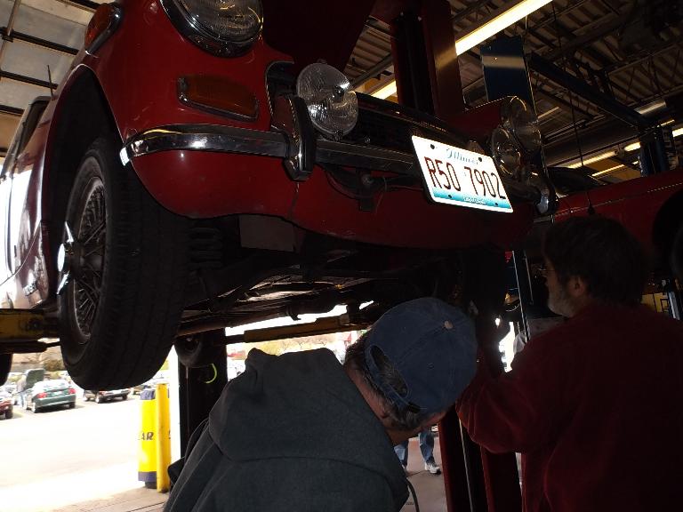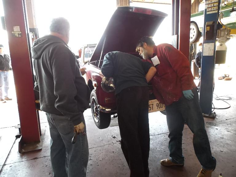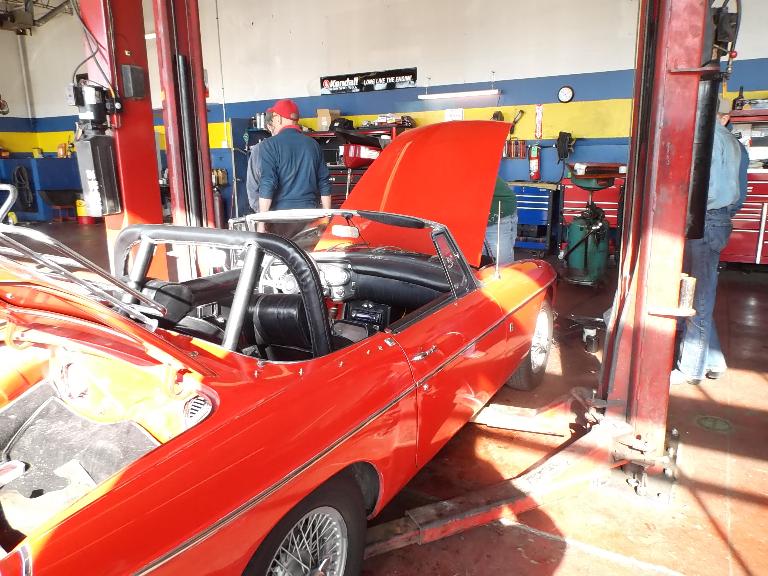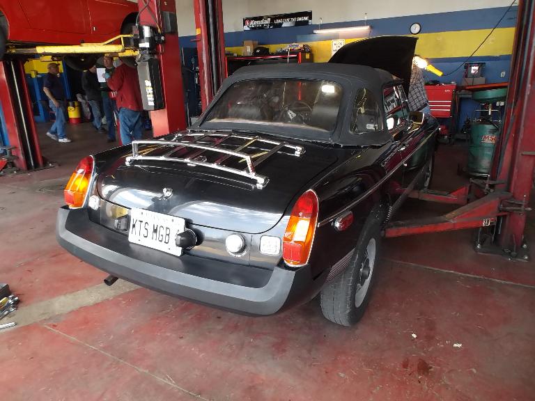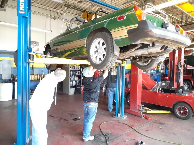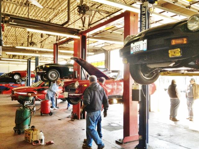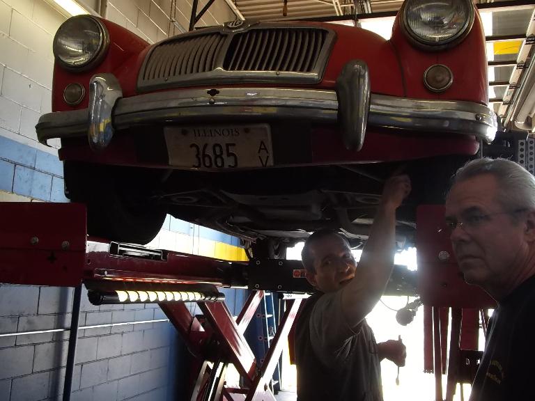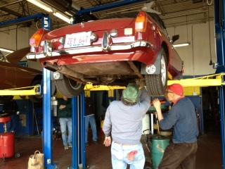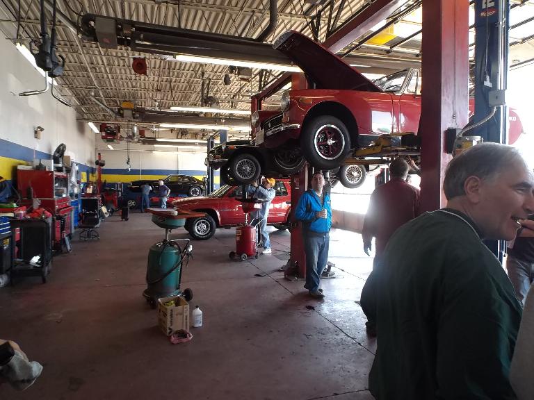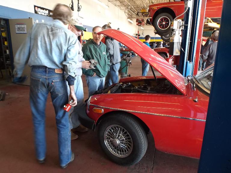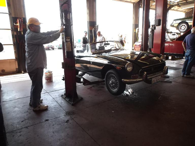 Nearly 30 MGs in attendance this year, perhaps a new record. Lots of oil changes and lube jobs, some tune-ups and brake adjustments, and a few minor repairs. Several cars got on the extra rack for front end alignment.