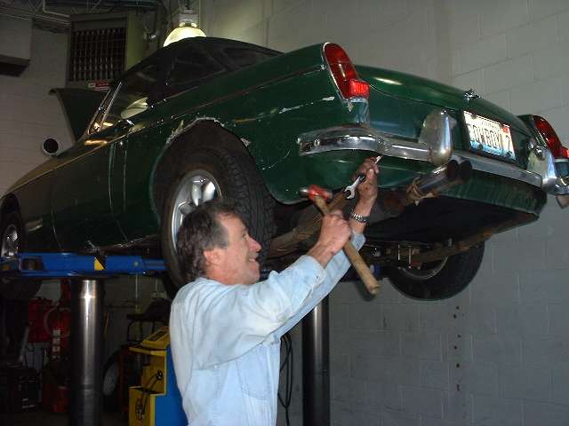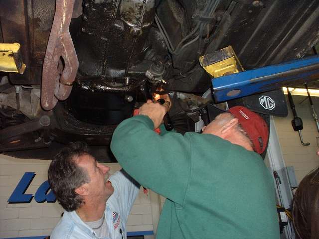Classic problem of the day trophy goes to this rubber bumper Midget with the B-A-A-A-A-D u-joint!!!. With at least 1/2 inch of lateral play and 30 degrees of free rotation, This one was almost a menace to society. The U-joint pins had worn all the way through the bearing cups and were chewing on the jokes. This propshaft is definitely trashed, but luckily Kim Tonry can provide a spare. A little too late in the day for the parts run, but it can be picked up on the way home (if the car drives REAL careful along the way). At the other end of the bay a rubber nose MGB was getting a brake check and a bit of oil in the steering rack.