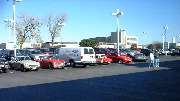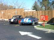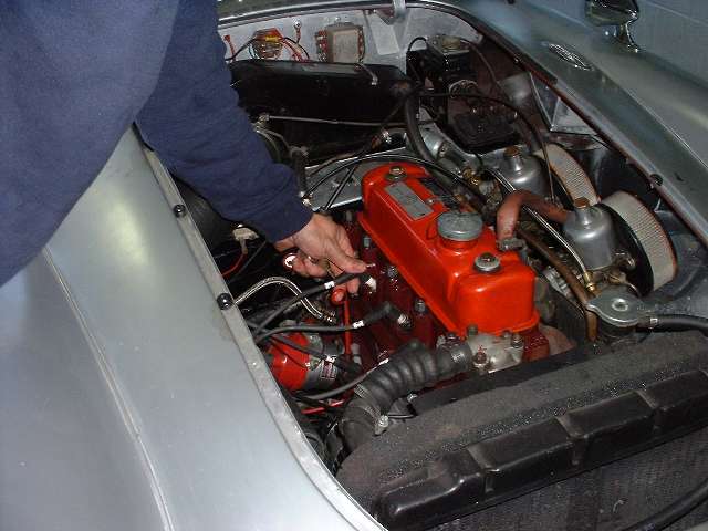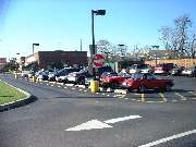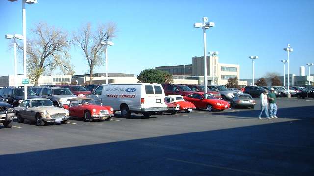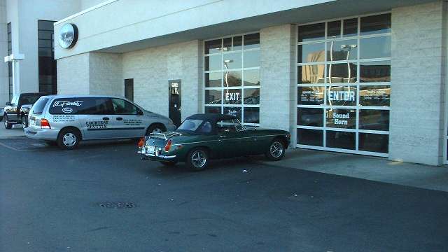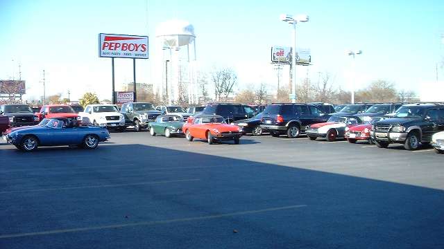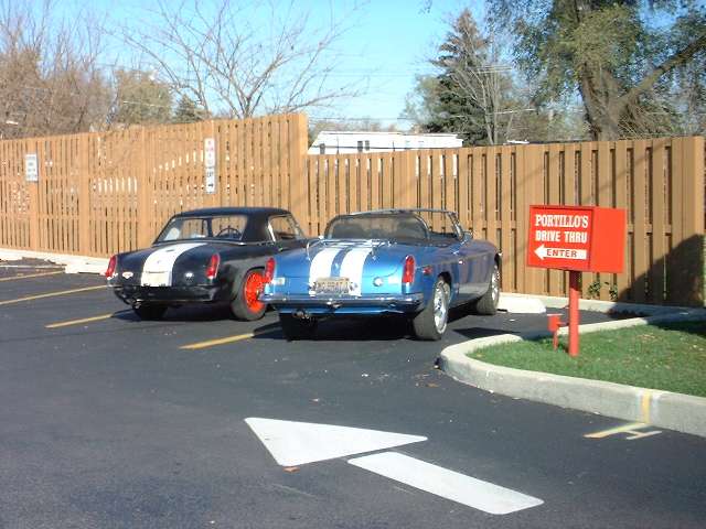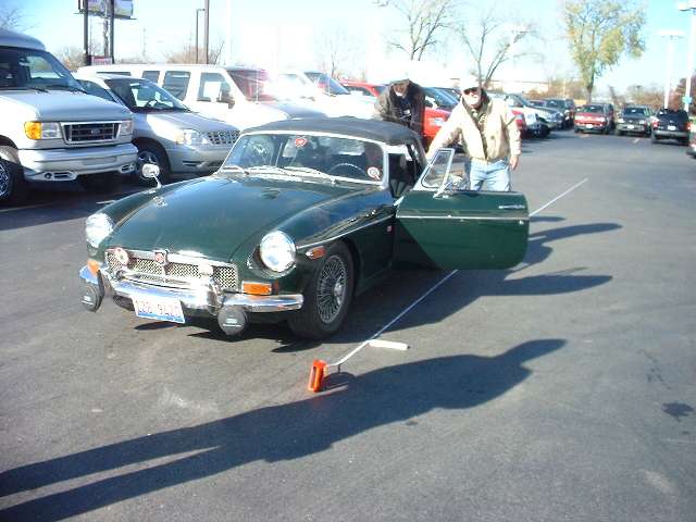 Meanwhile, out in the parking lot, an MGB was getting an odometer calibration test. Pull the speedometer out of the dash, disconnect the drive cable, and put a little flag on the output end of the cable so you can watch it turn. Get out the tape measure, lay out 52 feet 9-5/8 inches on the pavement (exactly 1/100 mile), and push the car through that distance while counting rotations of the speedo drive cable. Multiply by 100, and you have the turns per mile number required for the speedometer shop to recalibrate the instrument. Or otherwise, at least you know how bad the error can be while you're driving. When the work is finished, we can all head over to Portillo's for a well earned late lunch and more MG chat.