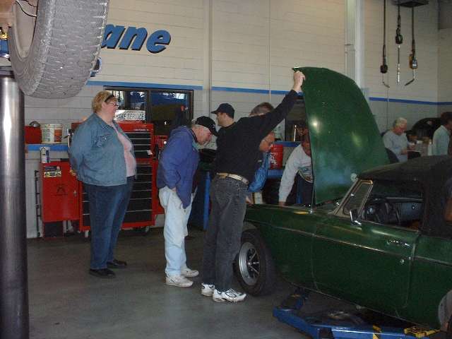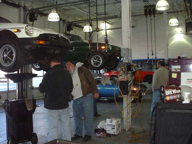 A day that started a little chilly, turned up very nice by noon. About two dozen MGs (and one Jaguar?) came out for the tinkering party. With five lifts going everyone got the service and attention they came for.